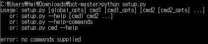 파이썬 setup 파일을 실행하려는데 error: no commands supplied 라고 뜬다.